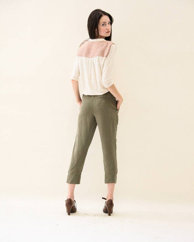 Enjoy the unrestricted comfort of a t-shirt and the put-together elegance of a blouse. Camas is designed to be comfortable and can be sewn in knits or stretch fabrics. It features shoulder and back yokes, elegant gathering, and a flattering curved v-shaped neckline placket. The curved hem can be tucked into trousers and skirts or can be left loose over jeans. The slim sleeves end just below the elbow to create the perfect multi-season blouse. Instructions detail how to create a variety of closures; learn how to add buttonholes to a knit placket, add snaps or skip button holes entirely and create a pull-over blouse.