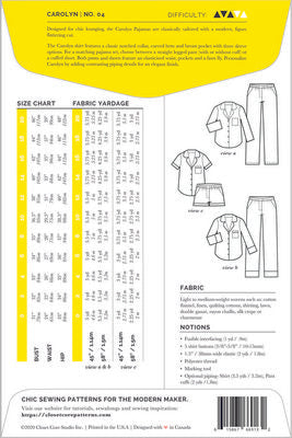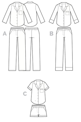 The Carolyn top features a classic notched collar, curved hem and breast pocket with three sleeve options. For a matching pajama set, choose between a straight legged pant (with or without cuff) or a cuffed short. Both pants and shorts feature an elasticized waist, pockets and a faux fly.