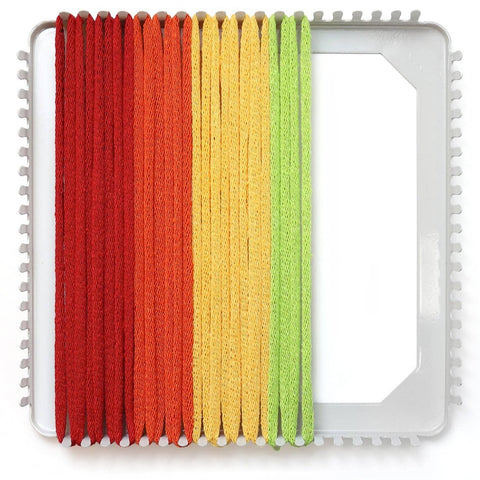 - Sturdy 7" x 7" metal loom with 19 pegs on each side