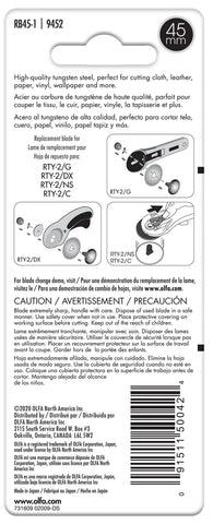 Made of tungsten carbide tool steel for for unparalleled sharpness and superior edge retention. Cuts up to 6 layers of fabric. For Original 45mm Rotary Cutter (RTY-2/G) and Deluxe 45mm Rotary Cutter (RTY-2/DX).
