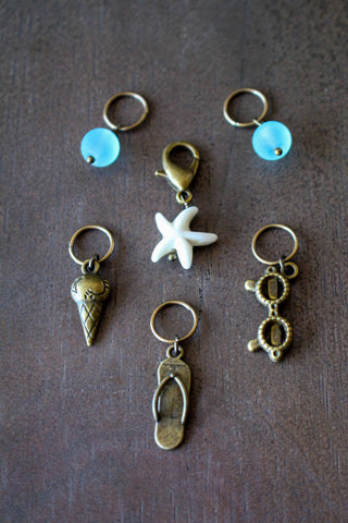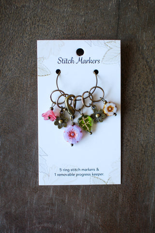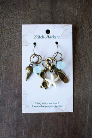 These stitch marker sets — made with Czech and crystal glass beads as well as antique bronze charms representing each season — consist of five ring stitch markers and one removable progress keeper. Fits up to US 10 needle. Made in California.