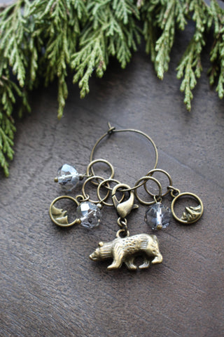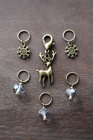 These stitch marker sets — faceted crystal glass beads and antique bronze snowflakes, mountains, deer and bear charms — consist of five ring stitch markers and one removable progress keeper. Fits up to US 10 needle. Made in California.